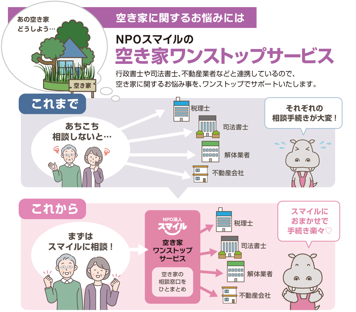 相続が発生したけれど、何から手をつけていいかわからない。税金や管理、売却など、漠然とした不安がある。そんな方のために、NPOスマイルでは中立的な立場での「空き家なんでも相談窓口」を運営しています。初回相談は無料です。お気軽にご連絡ください。